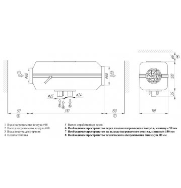 Отопитель требует подключения к сети постоянного тока 12В. Забор топлива производится по топливопроводу, который может заводиться в штатный бак с помощью топливозаборника, или же в отдельный бак.